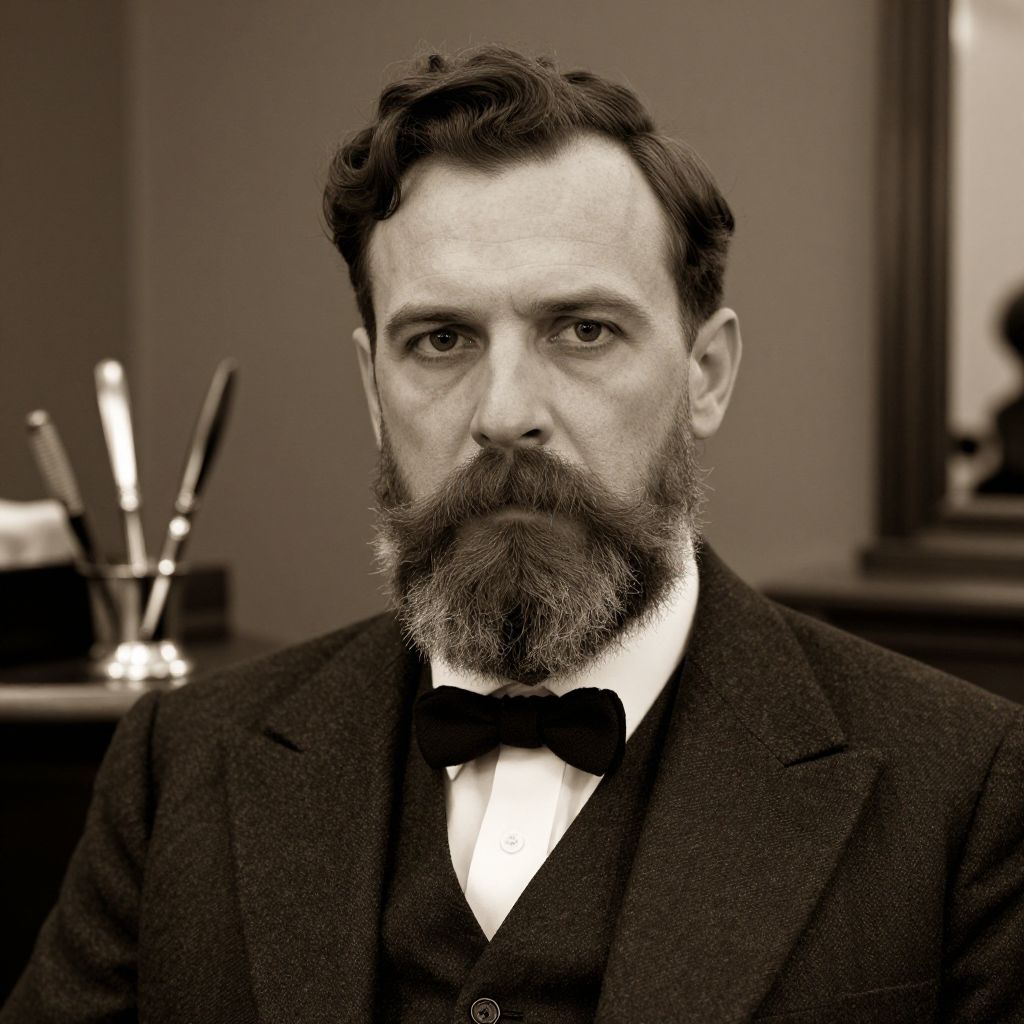 Tipo barba vintage style portrait of a gentleman with a meticulously shaped beard and mustache, sepia tones, old-fashioned suit, classic barber tools in background, warm lighting, soft focus with elegant and timeless atmosphere.