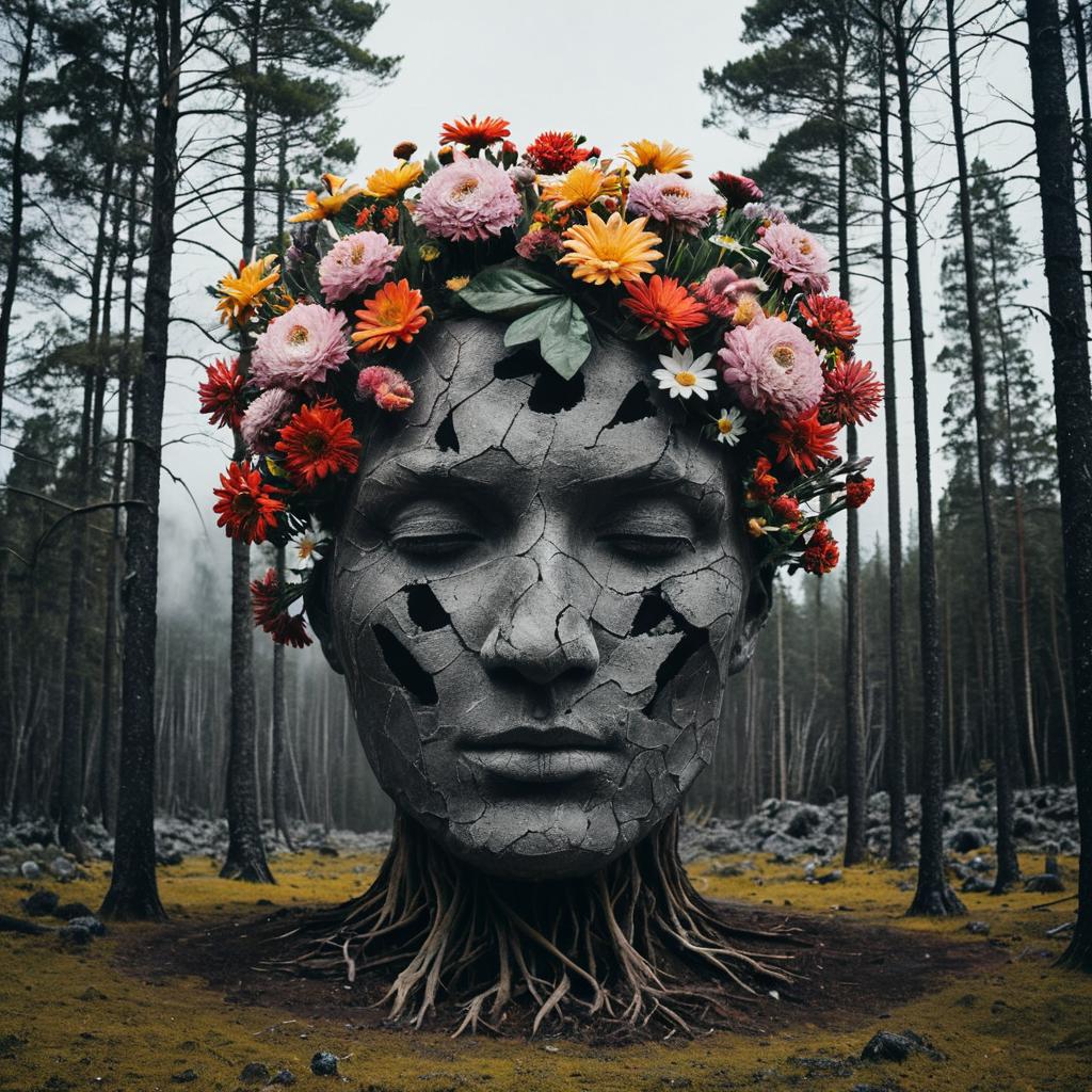 A photograph of a cracked stone head sculpture with closed eyes, standing in a foggy forest. The sculpture's face is adorned with a vibrant, colorful flower crown featuring red, orange, pink, and yellow flowers. The head is rooted in the ground like a tree, surrounded by tall, dark pine trees and a moss-covered forest floor. The scene has a surreal, mystical vibe.