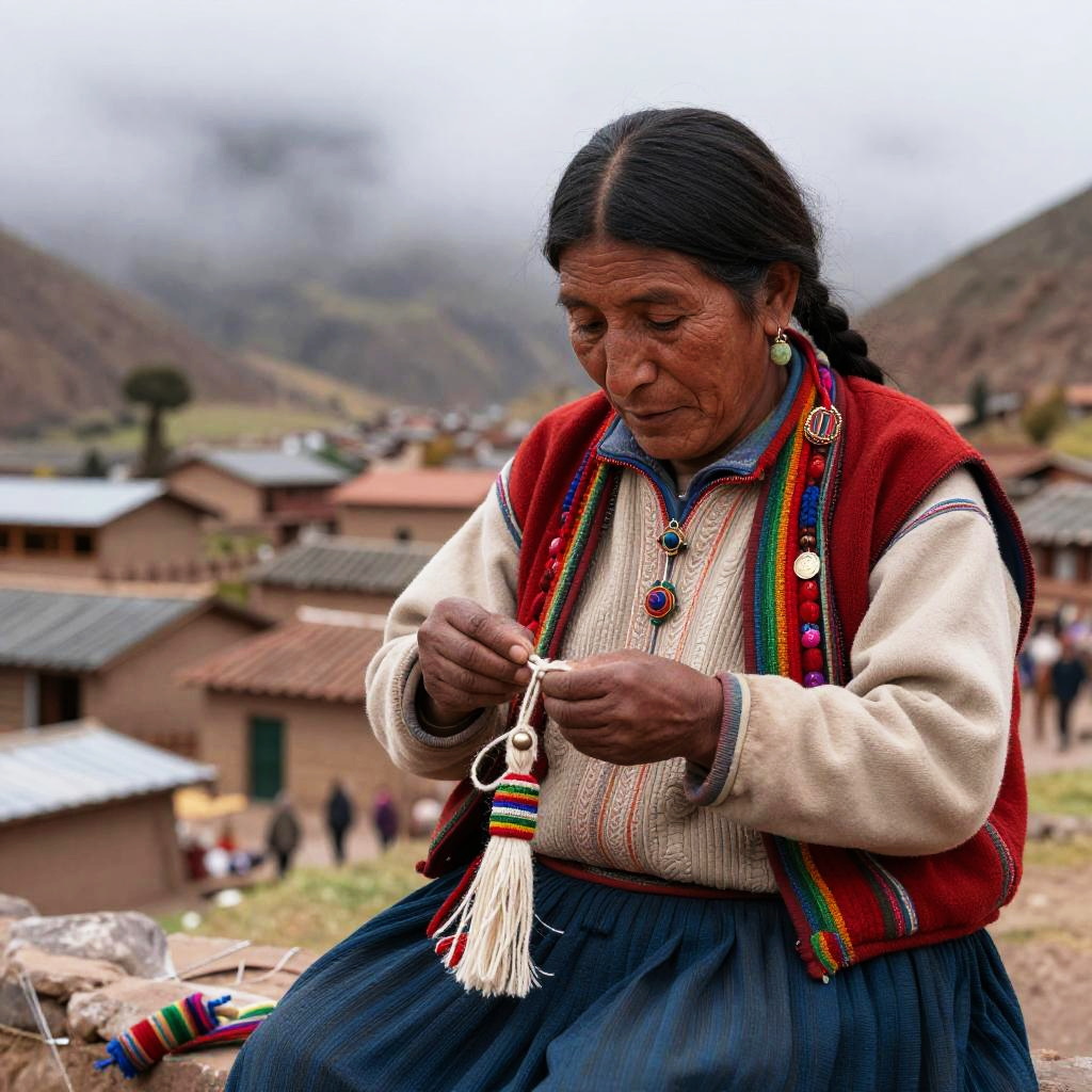 Photograph of an elderly indigenous woman with dark skin, long black hair, and traditional Andean attire, carefully threading colorful beads in a mountain village.