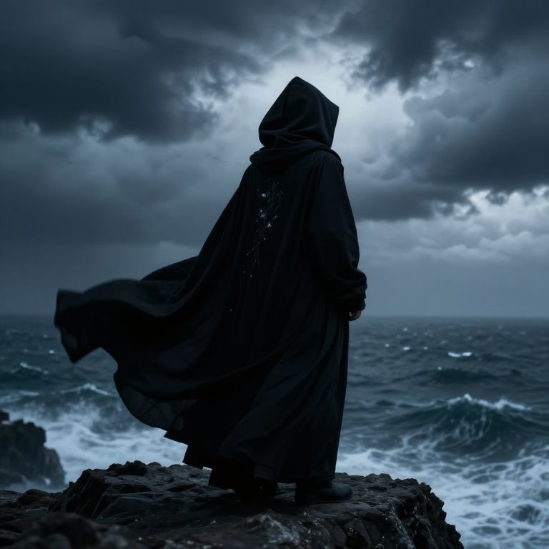 Silhouetted figure in a flowing dark cloak stands on rocky shore, facing stormy ocean under dramatic, cloud-filled sky. (Photograph)