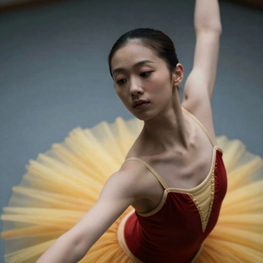 A ballet dancer (in a ballet pose:1.3), in a studio, wearing red ballet dress with yellow tutu, good hand, 4k, high-res, masterpiece, best quality, head:1.3, ((Hasselblad photography)), finely detailed skin, sharp focus, (cinematic lighting), soft lighting, dynamic angle, [:(detailed face:1.2):0.2], medium breasts