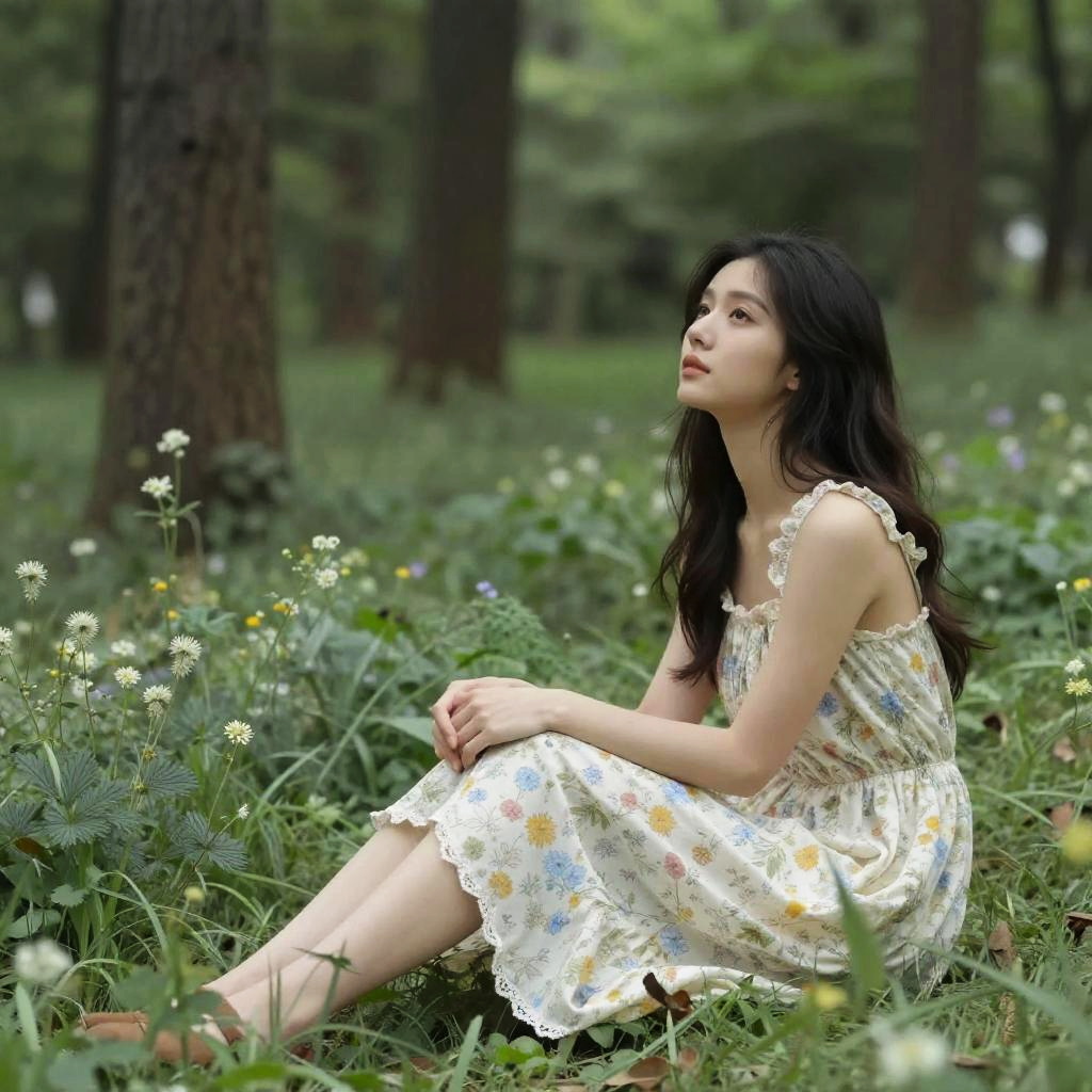 Photograph of a young Asian woman with long black hair, wearing a white floral dress, sitting in a lush, forested meadow.