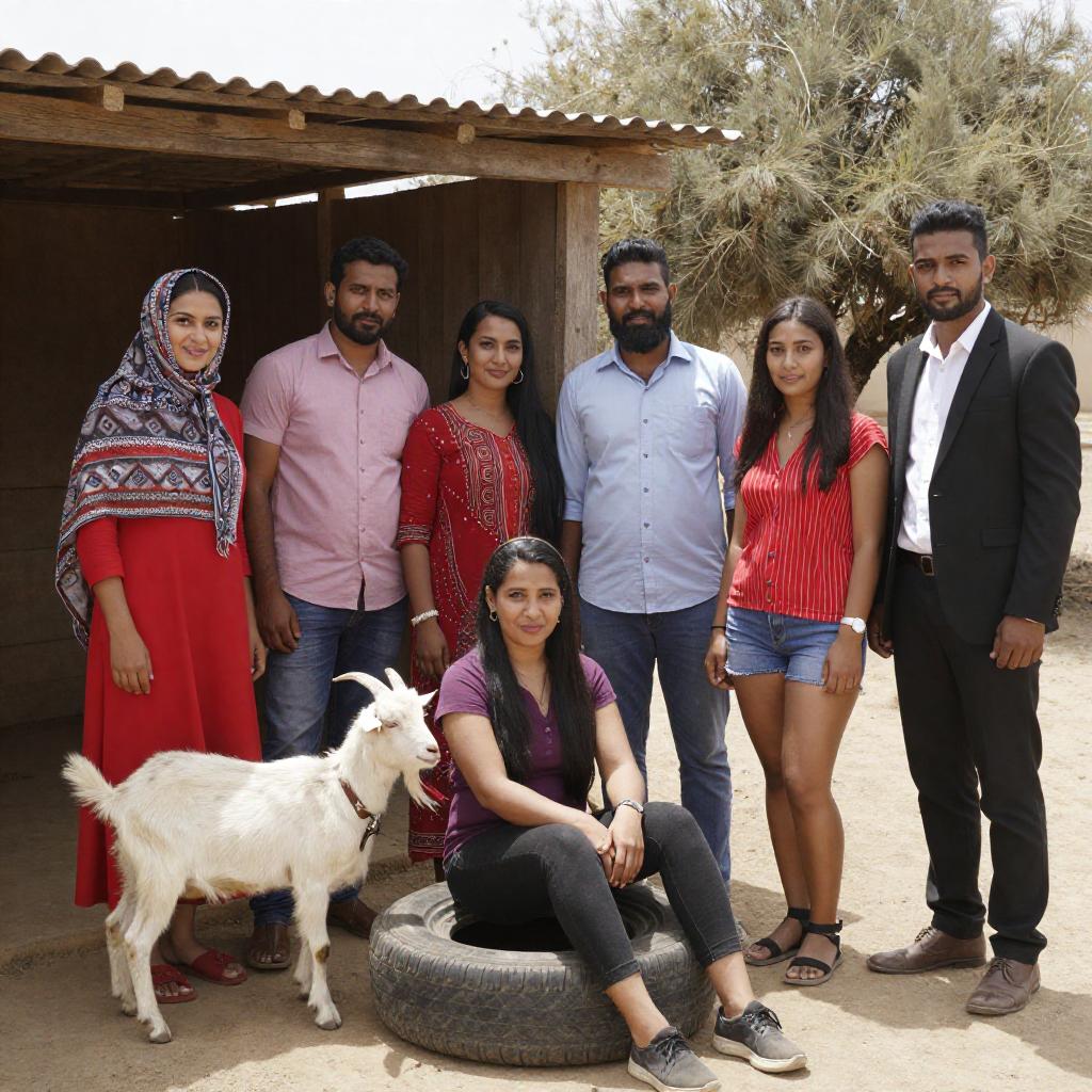 Group of twelve people, mixed genders, standing around a white table with a glass display case. Man in yellow sweater, man in brown sweater, and several men in suits and blue shirts. Blue and white balloons in background. Smiling faces. Indoor setting.