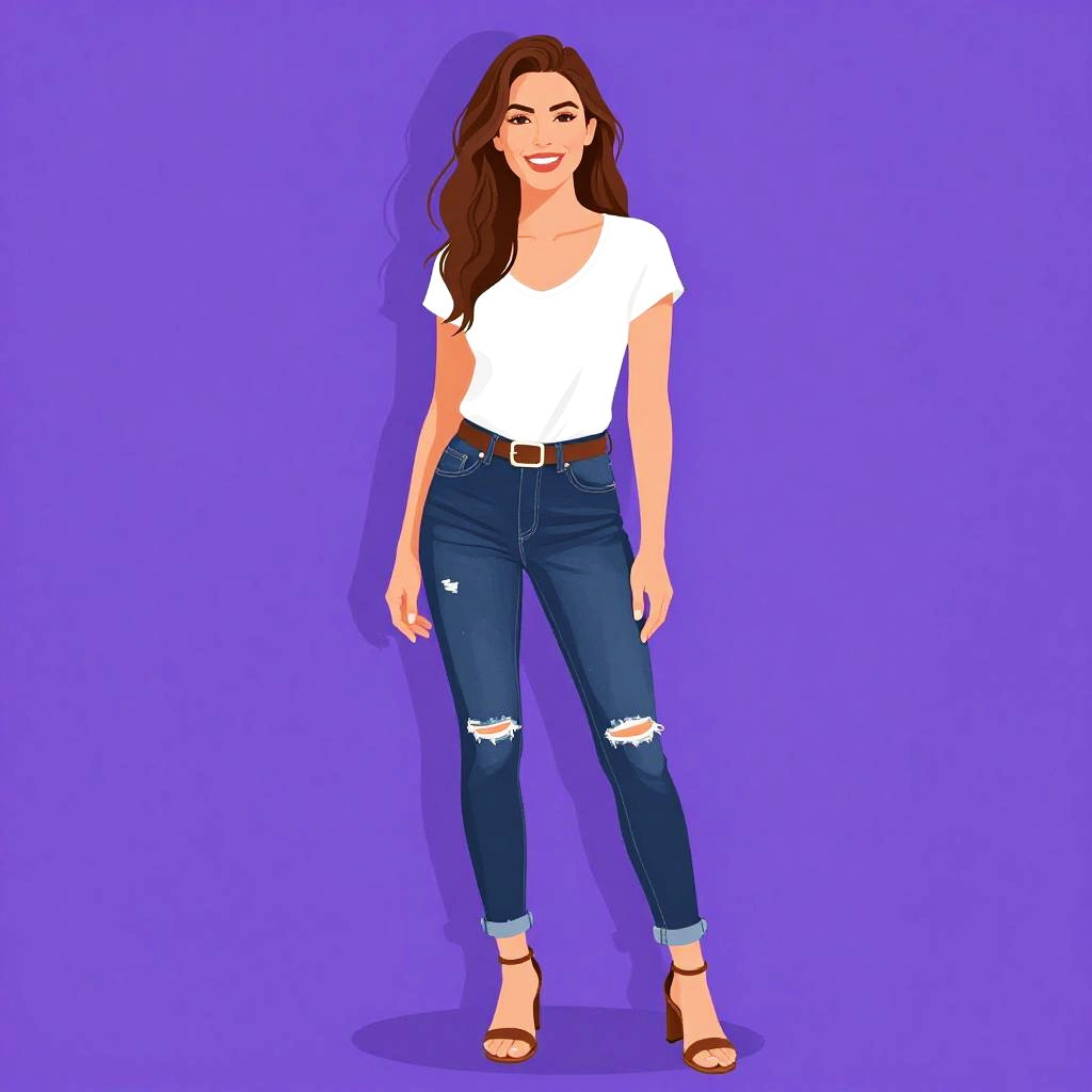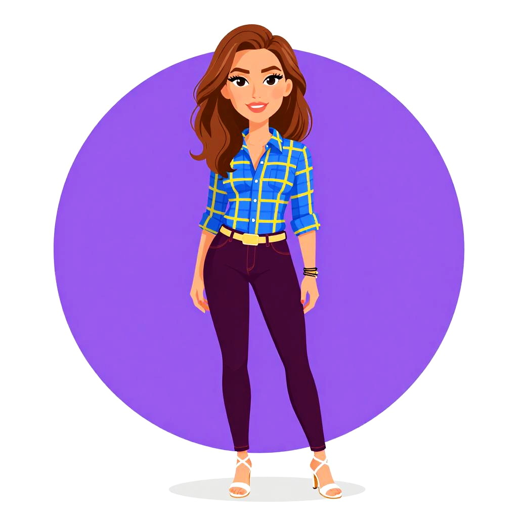 Digital illustration of a stylish woman with long, wavy brown hair and fair skin. She wears a blue and yellow checkered button-up shirt, black high-waisted pants, and beige high-heeled sandals. Her accessories include a black belt and a bracelet on her right wrist. She stands confidently against a solid purple circular background. The illustration features bold, vibrant colors and a cartoon-like style, with exaggerated facial features and a cheerful expression.