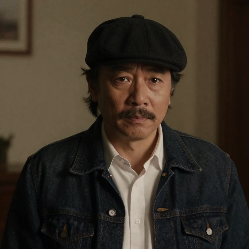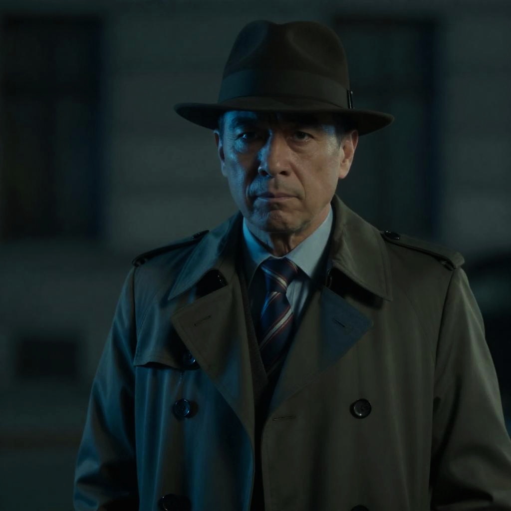 Middle-aged Man in Trench Coat and Fedora at Night