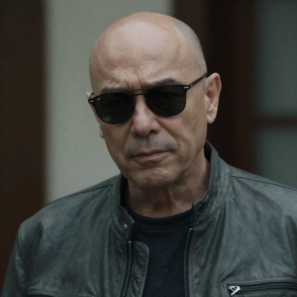 Middle-aged man with light skin, wearing dark brown fedora, olive green trench coat, and striped tie, illuminated by blue light. Shadows on his face. Dark, dimly lit urban background with blurred buildings. Serious expression. Nighttime. Blue and dark green lighting. Square block on left.