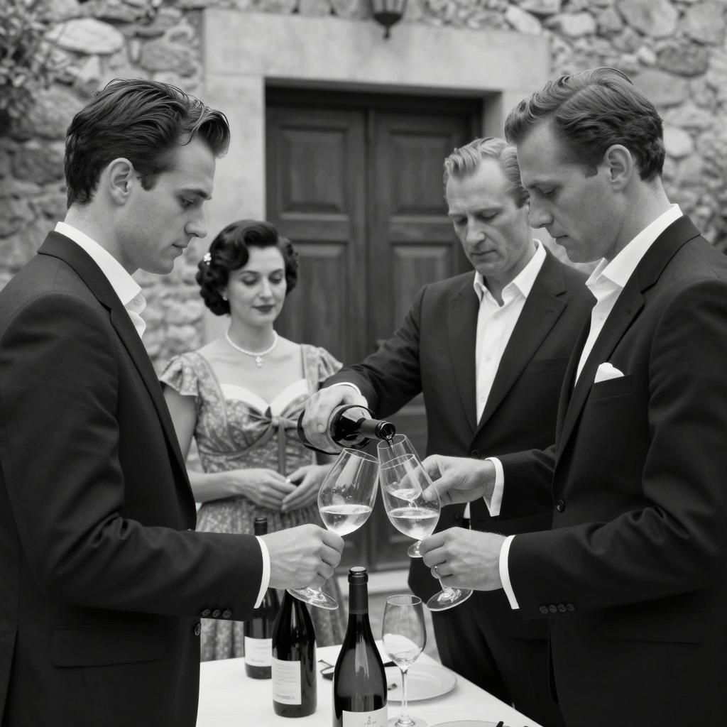 Four people. Three men in dark suits and white shirts stand at a table, pouring wine and arranging glasses. One woman with dark hair in a vintage dress stands in the background. Stone wall and wooden door in the background. Men in foreground have short, slicked-back hair. Woman has a delicate expression. Table has wine bottles and glasses. One man on the left holds a wine bottle, one on the right hands glasses to another man. All men facing each other.