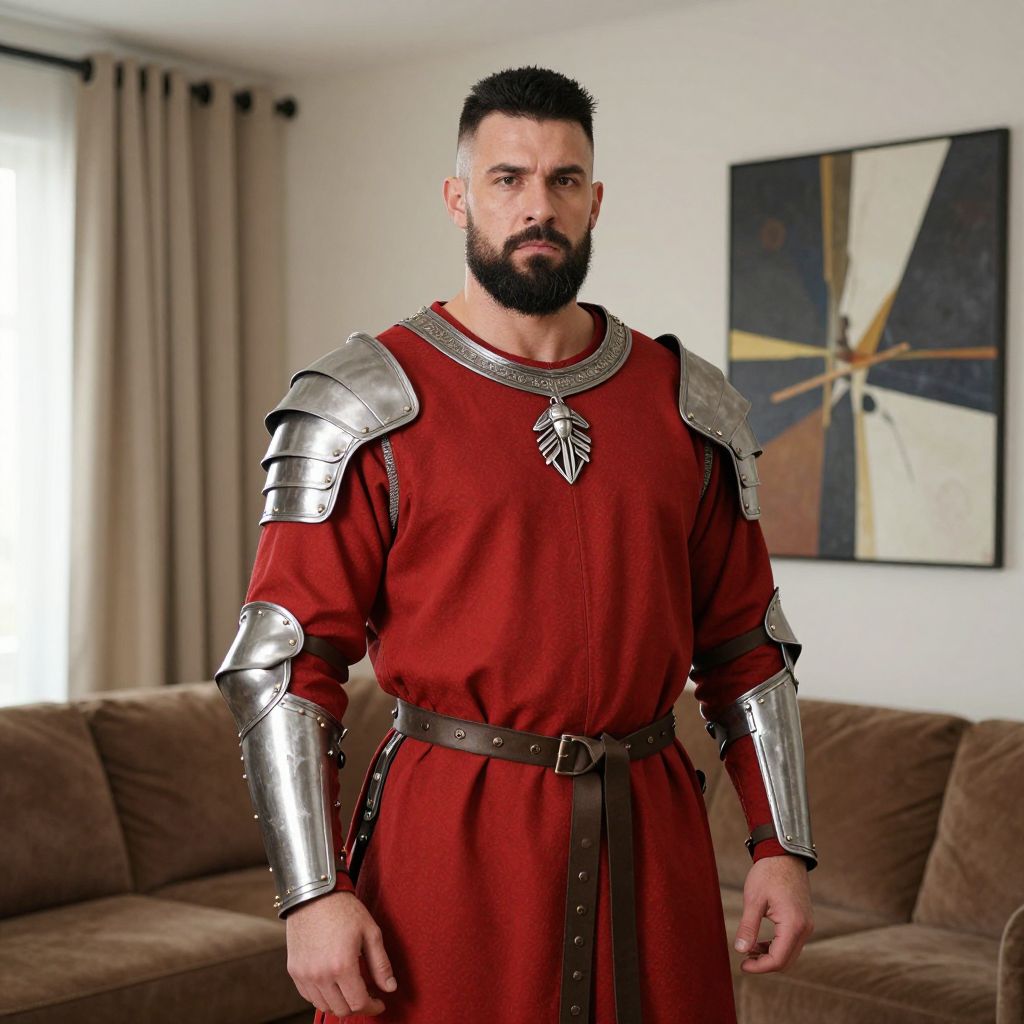 Photograph of a bearded man with a muscular build, wearing a red medieval-style tunic and silver armor, standing in a modern living room.