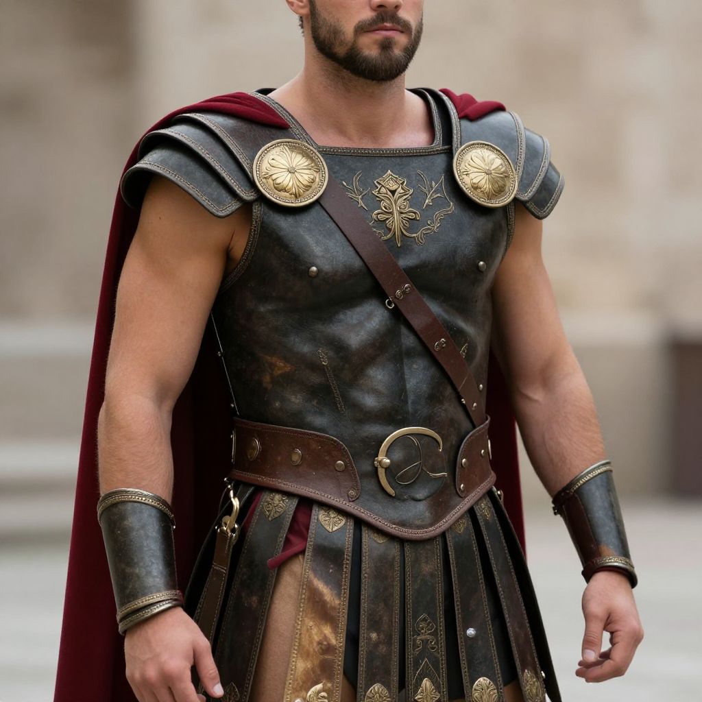 Photograph of a muscular man with a beard, wearing ancient Roman-style armor with gold embellishments, dark leather, and a red cape.