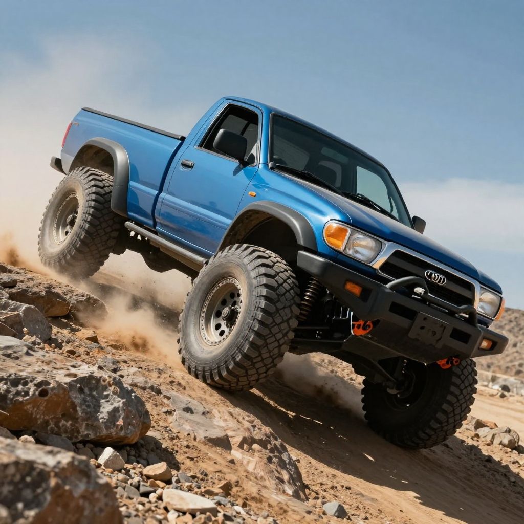 1994 Toyota Pickup blue, off-road adventure scene, truck climbing rocky hill, dust clouds, rugged tires and lifted suspension, dynamic angle, highly detailed and dramatic lighting