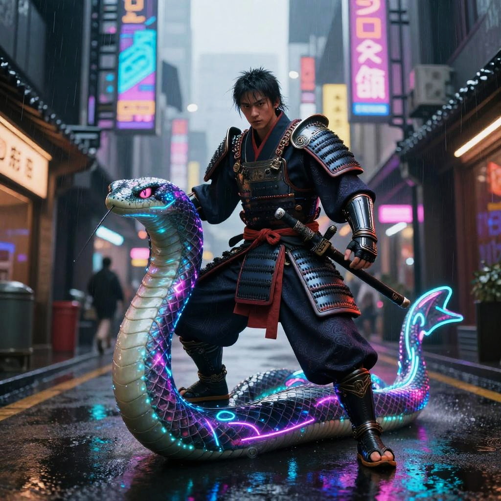 Digital art: Samurai warrior in glowing armor, helmet, and katana, kneels beside a bioluminescent snake in a neon-lit,