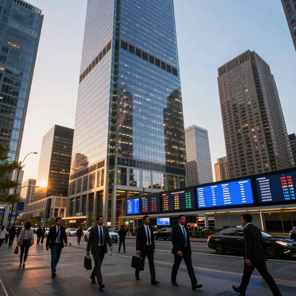 Evercore financial district at dawn, sleek modern skyscrapers with glass facades reflecting sunrise, people in business attire walking briskly, digital stock market tickers glowing, futuristic vibe, detailed cityscape with dynamic lighting, corporate energy