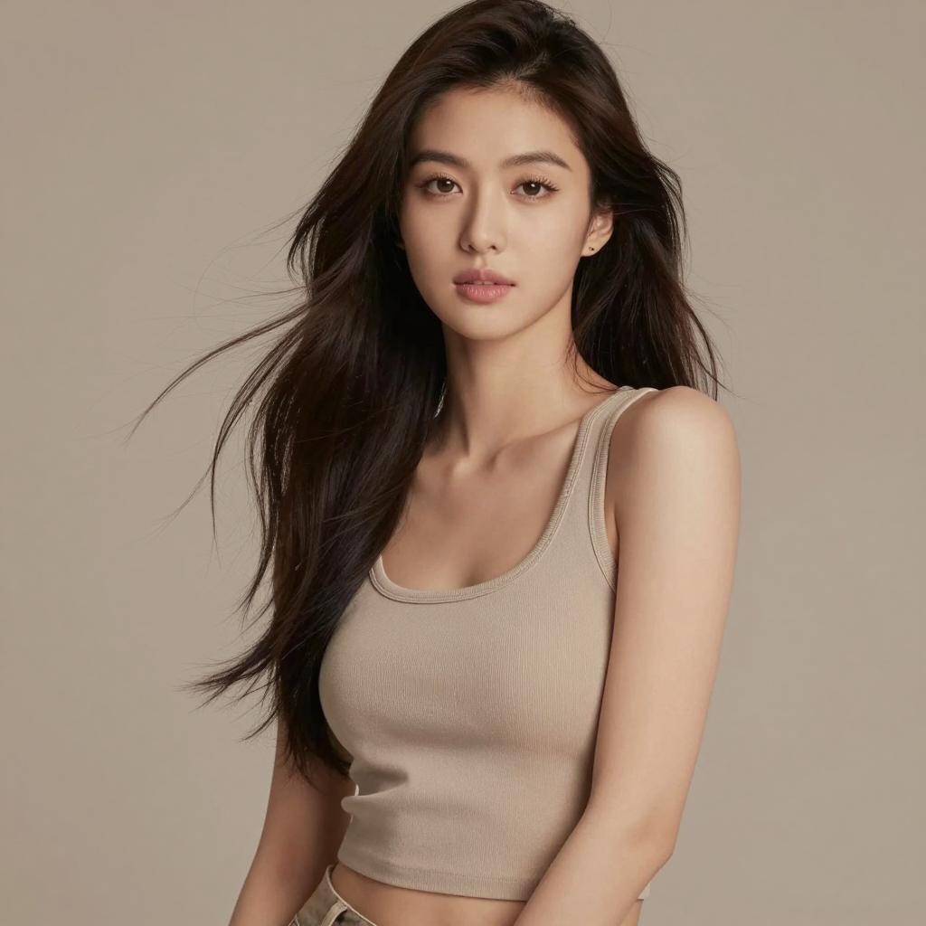 Digital portrait of a young Asian woman with medium-length black hair wearing a yellow sports bra and a yellow jacket partially off her shoulders. She has light brown skin, dark eyebrows, and a slight smile. The background features a soft light blue gradient.