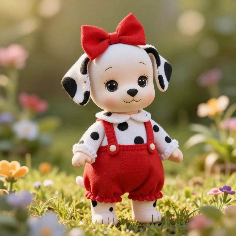 A cute porcelain doll standing in a cozy, sunny garden filled with soft grass and blooming flowers, wearing a detailed dalmatian-themed outfit made of red and white fabric with black spots meticulously resembling a classic dalmatian's pattern. The doll has large, expressive, sparkling eyes that convey a playful and warm emotion, a small red bow tied neatly on its head, and a slightly mischievous, charming smile that adds to its whimsical personality. Its delicate porcelain skin catches the sunlight, giving it a soft, luminous glow, while the natural greenery and golden afternoon light enhance the serene and nostalgic atmosphere. The scene is painted with a blend of warmth, innocence, and subtle fantasy, perfectly blending whimsy and charm in a timeless, heartwarming setting.
