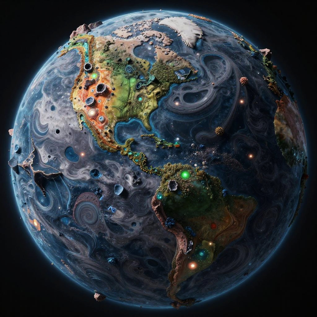 AI game texture generator designing high-detail alien planet surfaces with colorful mineral deposits, unusual rock formations, and bioluminescent textures, surreal and vibrant digital art style with strong contrast and depth.