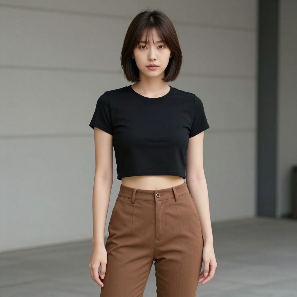 Photograph of an East Asian woman standing indoors against a plain, light-gray wall. She has a straight, shoulder-length black bob haircut with bangs. She wears a fitted, short-sleeved black crop top that reveals her midriff, and high-waisted, brown trousers with a button and belt loop. Her expression is neutral, and she stands with her arms relaxed by her sides. The lighting is natural, highlighting her fair skin tone. The background is minimalistic, with a smooth, light-gray wall and a concrete floor. The image has a sharp, realistic style.