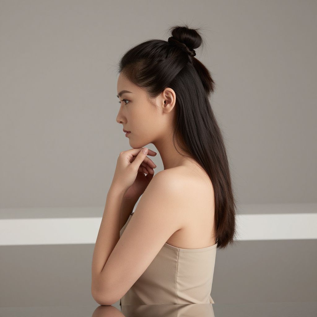 Photograph of an East Asian woman with fair skin and long, straight black hair tied in a high bun. She is seen in profile, facing left, wearing a strapless, beige satin top. Her hands are gently clasped near her chin, highlighting her delicate features and contemplative expression. The background is minimalistic with a smooth, light gray wall and a horizontal white light strip, creating a modern, serene atmosphere. The lighting is soft, emphasizing her smooth skin and the subtle sheen of her top.