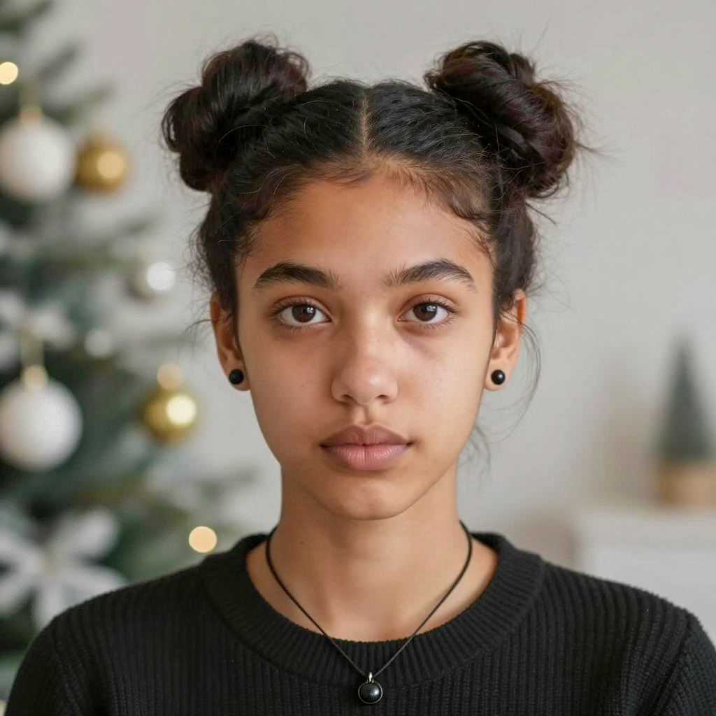 Photograph of a young woman with medium brown skin and dark brown eyes, wearing a colorful, striped knit hat with rainbow yarn and matching long braids. Her expression is neutral. She has straight black hair, full lips, and is looking directly at the camera. The background is out of focus, emphasizing her face and hat. She wears a rainbow scarf.