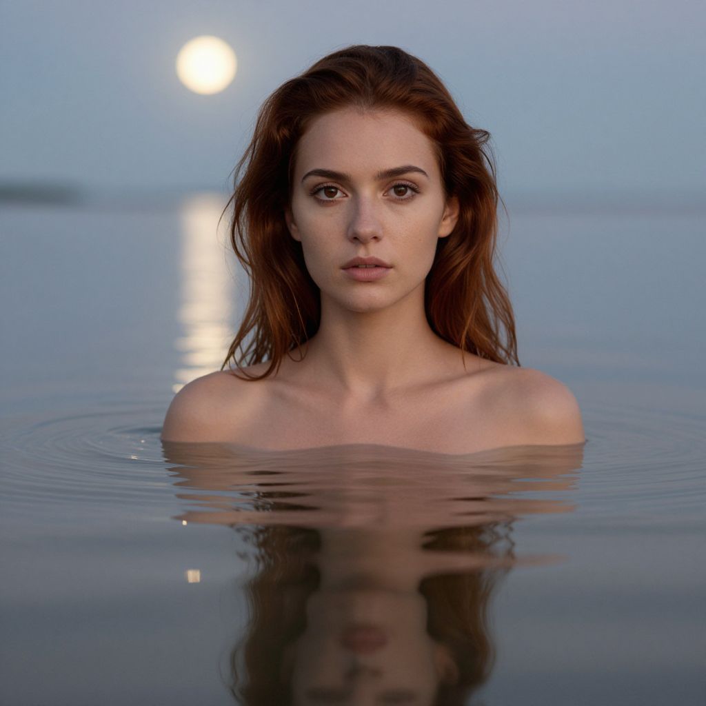 A serene portrait of a young woman with deep brown eyes and flowing auburn hair stands out against the soft moonlight at the water's edge. Her reflection seamlessly blends with the silvery surface, mirroring the starlit sky above. Gentle ripples dance around her feet, creating an ethereal interplay of light and shadow that accentuates her sturdy features. With a contemplative expression, she exudes a deep connection to nature, where land and water blur together in the twilight's ethereal glow.