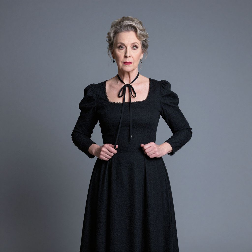 Wicked Stepmother Costume, an older woman in a black dress and a tiable