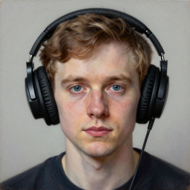 Photograph of a young white man with light brown, wavy hair and blue eyes, wearing a black shirt and large black over-ear headphones. His expression is neutral, with slightly parted lips and fair skin. The background is a plain, light gray wall, providing a simple and unobtrusive backdrop that focuses attention on his face and headphones. The image has a slight digital enhancement, evident in the slightly exaggerated facial features and smooth texture. The headphones' cable hangs down to the lower right of his face.