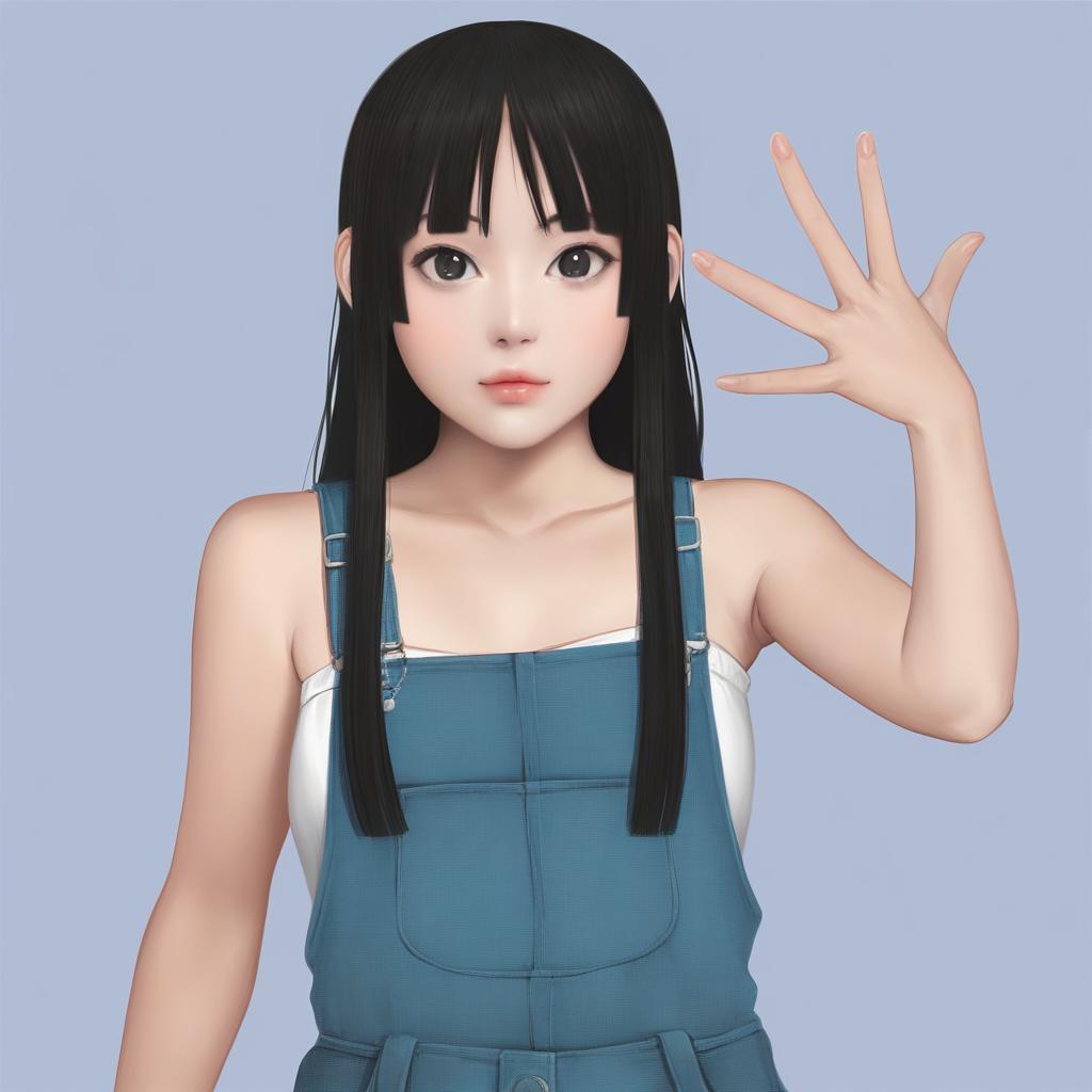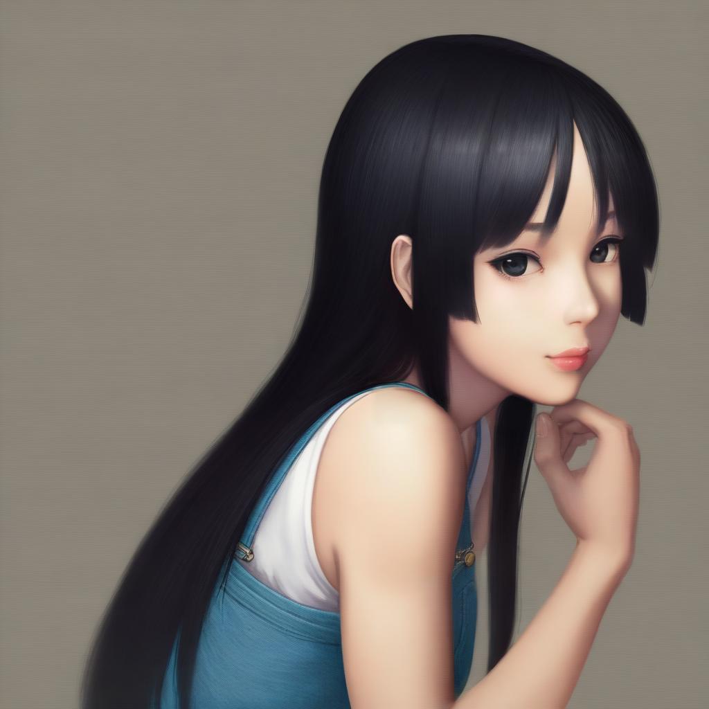 Akiyama mio, k-on!, 1girl, black eyes, long hair, black hair, sakuragaoka high school uniform, hime cut, solo, overalls, radiant young woman with lustrous black hair and sparkling black eyes, realistic, intricate anatomy, realistic skin tone, casual expression, elegant posture, denim texture, bare shoulders, functional clothing, slender fingers, simple background