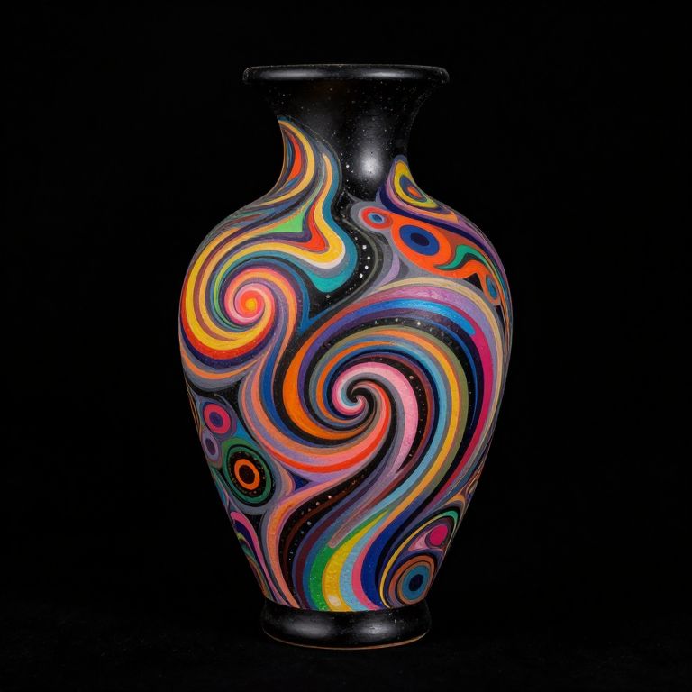 Photograph of a glossy, black ceramic vase adorned with vibrant, swirling, abstract patterns in neon colors like orange, pink, green, blue, and yellow. The design features curving lines and circular shapes, creating a dynamic, psychedelic effect. The vase has a narrow neck and a rounded body, set against a solid black background, which enhances the bright colors and intricate patterns. The surface of the vase is smooth and reflective, adding a three-dimensional quality to the image.