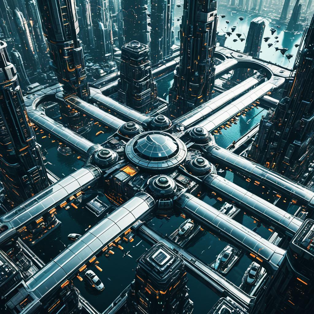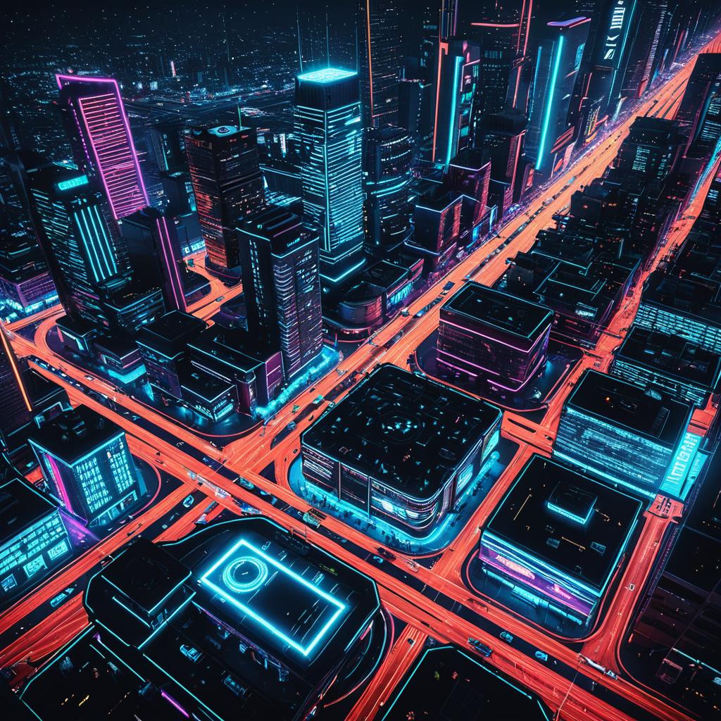 A stunning bird's-eye view of a bustling neon-lit cyberpunk downtown with glowing neon highways and flying vehicles, captured in realistic 3D render,