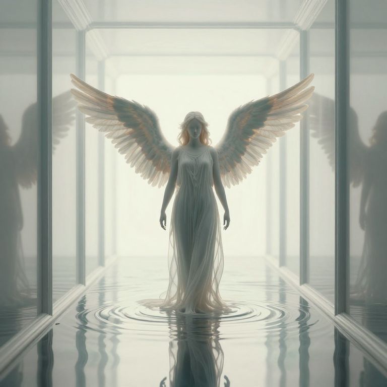 A surreal 3D-rendered scene depicts a solitary angel with ethereal wings standing in a mirrored corridor bathed in soft, diffused light, creating a dreamlike atmosphere where reflections ripple like ink across the glossy floor, evoking a sense of infinite depth and mystery.