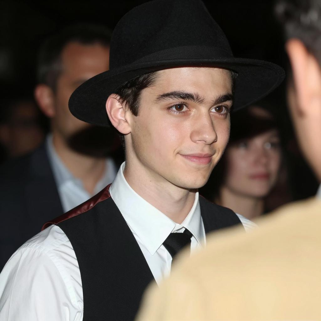 Photograph of a man with fair skin, brown eyes, and dark brown hair, wearing a black hat with a red band, red jacket. Blurred man with beard in brown shirt in background. Second person's face partially visible, green shirt.