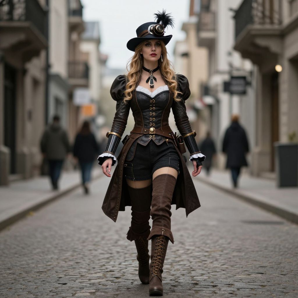 Photograph of a blonde woman in steampunk attire, black corset, brown leather boots, and hat, walking down a cobblestone street