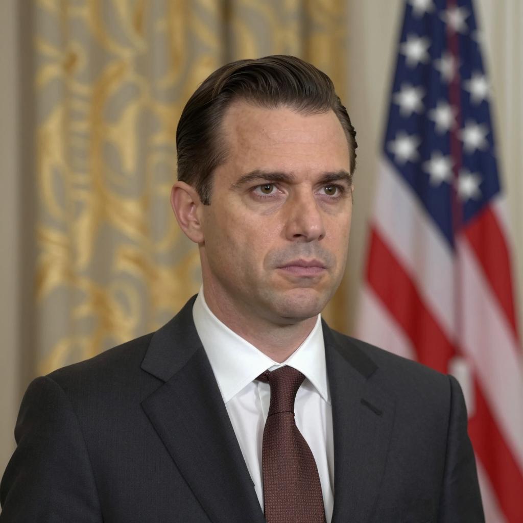 A man with slicked-back brown hair, wearing a dark plaid suit jacket, black shirt, and patterned tie, resting his chin on his right hand. Background has a blurred crowd of people. Man's expression is thoughtful. Lower half of face and upper body visible. Warm lighting. Multiple people in background, out of focus.