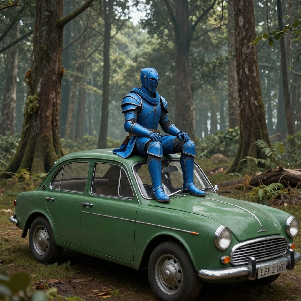 Blue knight sits on top of a green car, elegant scene, indian forest, wide angle, cinematic, ultrarealistic, trending on artstation, cgsociety, highly detailed, color graded, rendered in unreal engine 4 k hq, matte painting, by simon stalenhag, horizon forbidden west