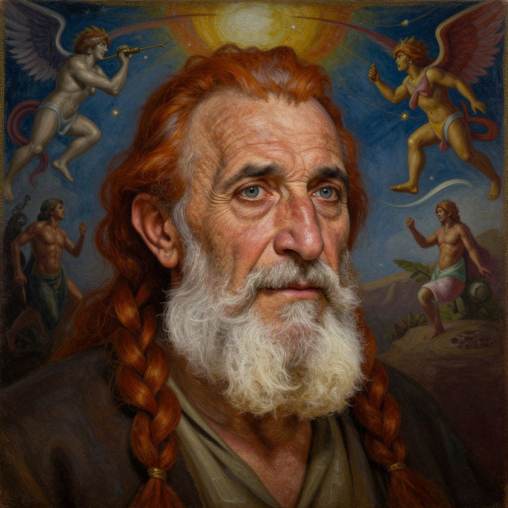 Digital painting of an elderly white man with a long white beard, red hair in braids, surrounded by angelic figures in a celestial backdrop with a