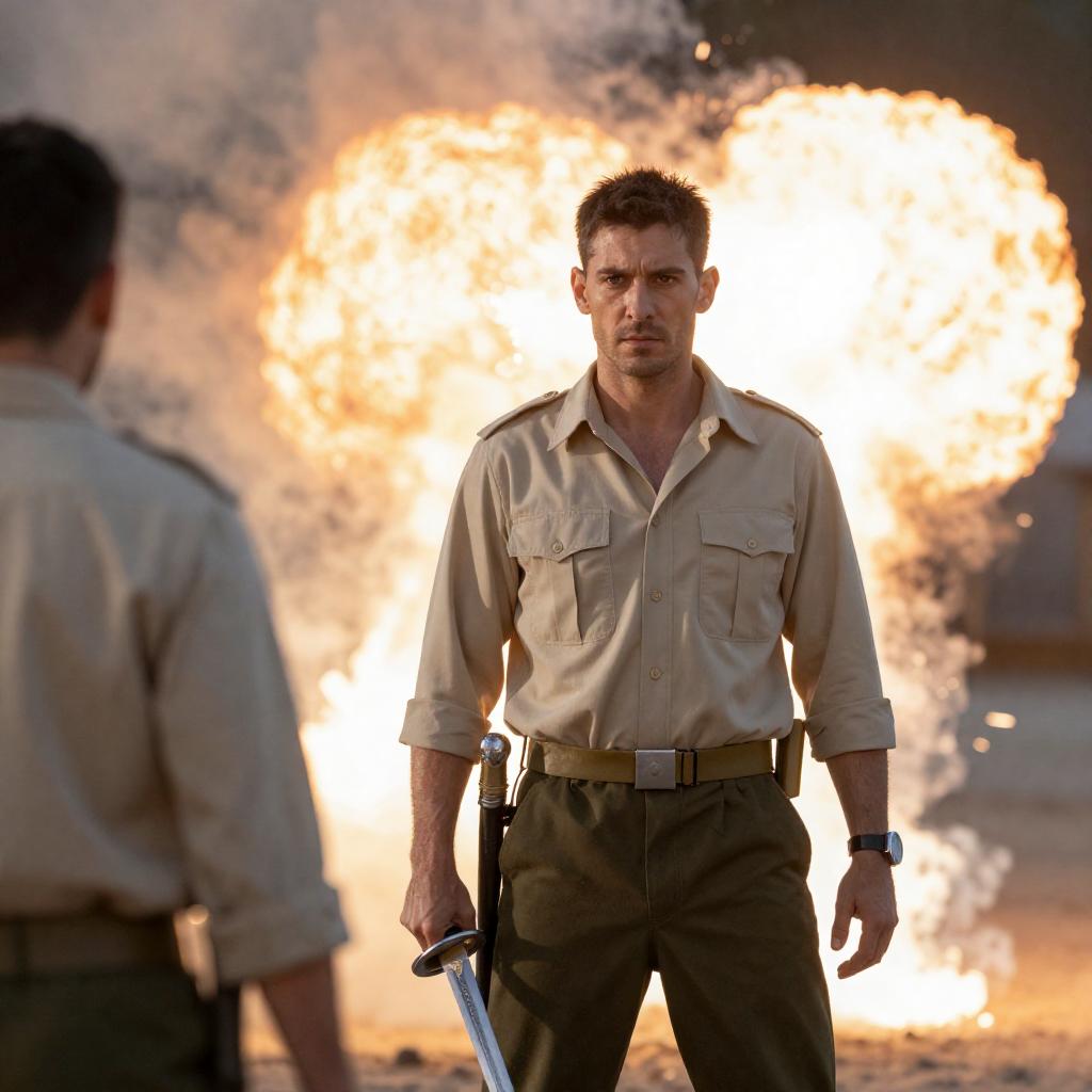 Photograph of a man with short dark hair, wearing a beige military-style shirt and dark pants, holding a sword in his right hand. He stands in front of a bright, smoky explosion, with another person's back visible to the left. The man's expression is determined, and the scene is illuminated by the explosion's light.