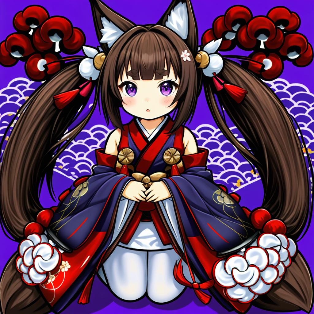 Amagi-chan (azur lane), azur lane, 1girl, fox girl, fox ears, fox tail, animal ear fluff, purple eyes, thick eyebrows, eyeshadow, brown hair, long hair, twintails, blunt bangs, sidelocks, hair ribbon, kimono, kimono, wide sleeves, long sleeves, detached sleeves, kyuubi, shimenawa, by artist mana (tsurubeji), anime