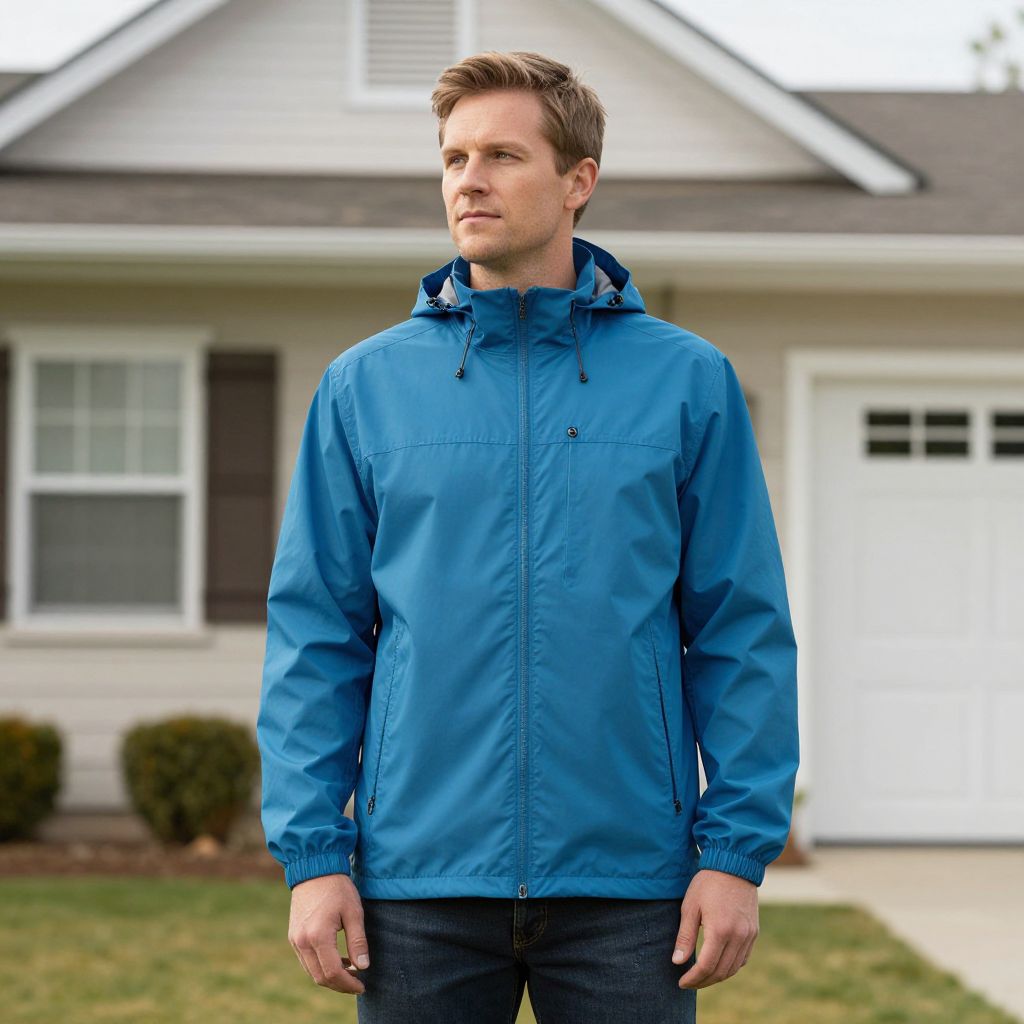 "Light Windbreaker, man in a blue jacket standing in front of a house"