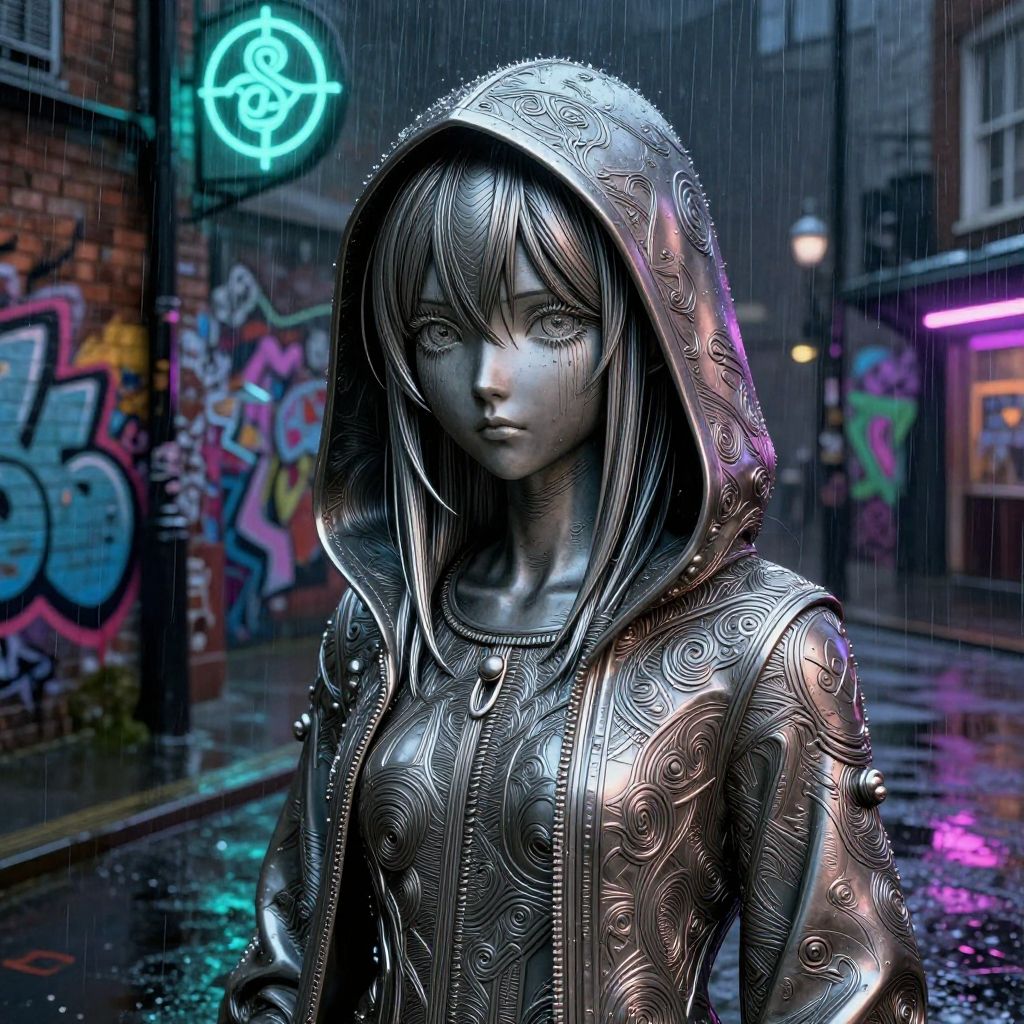 (close up portrait:1.1), Damasus steel, inspired masterpiece featuring an anime hood girl standing alone on a rainy night. The environment blends magical realism with sci-fi elements, showcasing graffiti-covered brick walls with glowing, ethereal symbols. Incorporate highly detailed, intricate textures reminiscent of sculptures, with fine line art and subtle metallic reflections, anime hood girl, rainy night, graffiti-covered brick walls, glowing symbols, dark shadows, tar-stained pavements, neon-colored accents, ( 3D tessellations:1.4), cinematic composition, atmospheric lighting, ultra detail, impressive line art, ( London streets:1.4)
