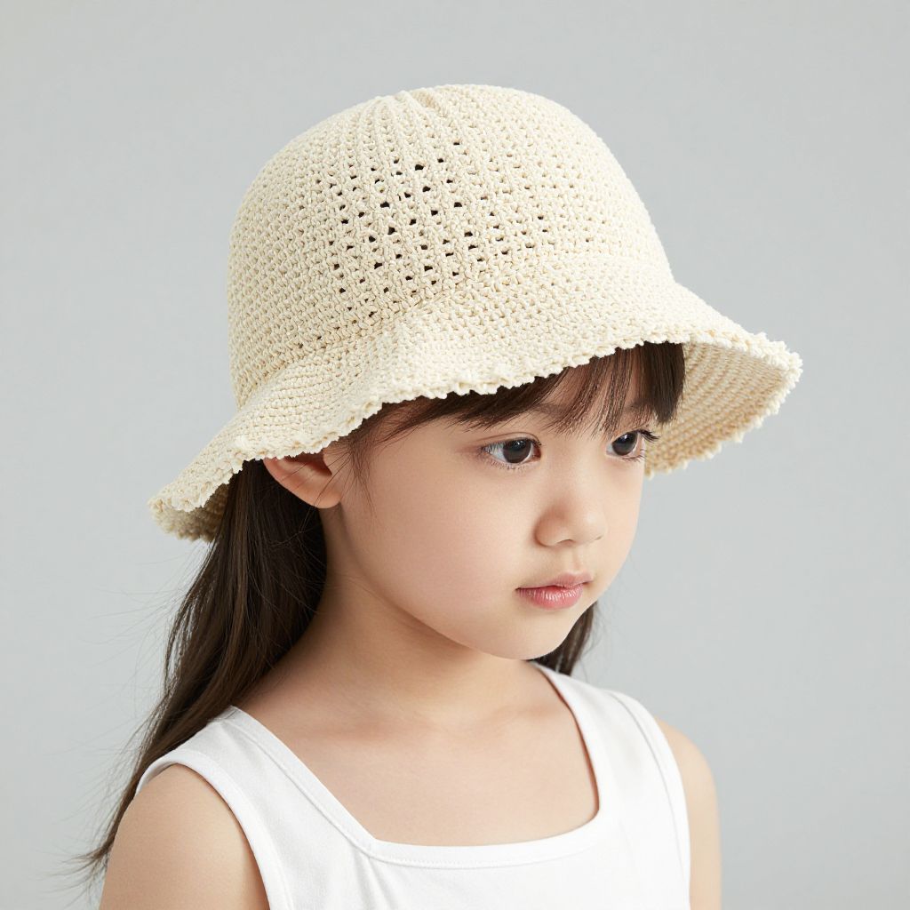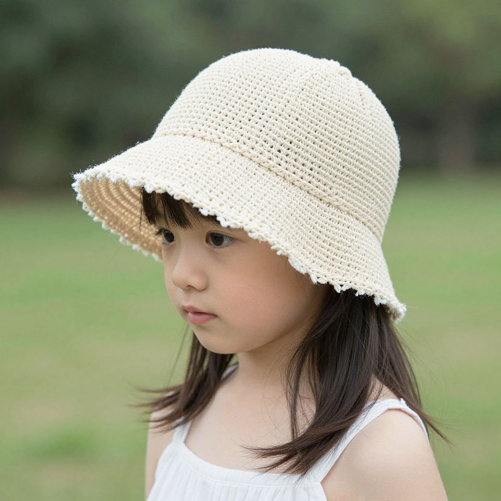 Photograph of an Asian young girl with light skin and straight black hair, wearing a white, crocheted sun hat with a scalloped edge. She has a neutral expression and is dressed in a simple white sleeveless top. The background is a blurred, green grassy field with dense, dark green trees in the distance, suggesting an outdoor park setting. The girl's face is slightly turned to the left, and the hat casts a subtle shadow over her forehead. The image has a soft focus, emphasizing the hat's texture and the girl's calm demeanor.