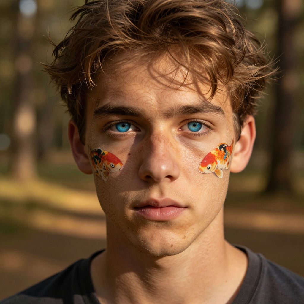 Photograph of a young, fair-skinned man with tousled brown hair and striking blue eyes, standing in a sunlit forest. He has vibrant orange and red fish-shaped face paint on his cheeks. He wears a simple black shirt, and his expression is neutral, with slightly parted lips. The blurred background features tall trees and dappled sunlight. The image has a realistic, high-contrast style with vivid colors and sharp details, emphasizing his facial features and the fish paint.