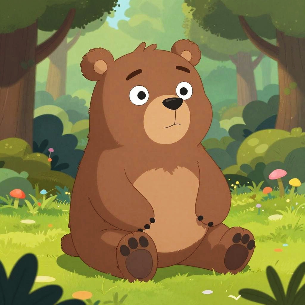 Bear Pepe character sitting in a lush forest, vibrant cartoon style, detailed fur texture, expressive eyes, whimsical and playful atmosphere, bright colors, fantasy woodland background