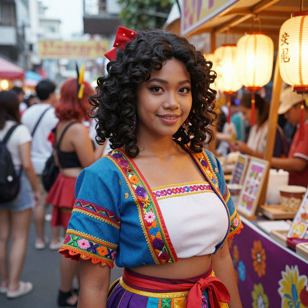 Photograph of a young Black woman with curly black hair and a red bow, standing in a bustling outdoor market. She wears a blue embroidered top with white center, short sleeves, and a purple skirt with a red sash. Her top features colorful floral patterns and she has a confident smile. The background is filled with blurred market stalls, bright lanterns, and people in casual summer clothes. The market atmosphere is lively, with warm, colorful lights and signs in the distance. The woman's attire and the market setting suggest a cultural or festive event.