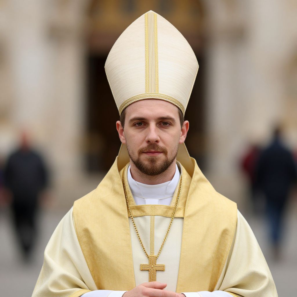 Photograph of a Caucasian male Catholic priest with a light beard and mustache, wearing a cream-colored mitre and matching vestments with gold trim. He has a fair skin tone and is looking directly at the camera with a slight smile. Around his neck is a gold cross necklace. The background is blurred, featuring indistinct figures and architectural elements, suggesting an outdoor urban setting. The priest's attire is formal and ceremonial, with a soft, luxurious texture to the fabric. The overall atmosphere is solemn and dignified.