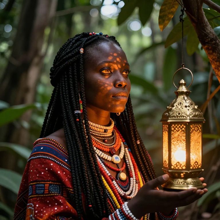 Photograph of a dark-skinned African woman with long, braided hair adorned with small beads, standing in a lush, green forest. She wears a red, patterned traditional dress with colorful beaded necklaces and earrings. Her face is illuminated by the warm, orange glow of an ornate, brass lantern she holds in her right hand. The background is blurred with dense foliage, highlighting the subject. The lantern's intricate design contrasts with the natural setting, creating a striking visual. The woman's expression is serene and contemplative.