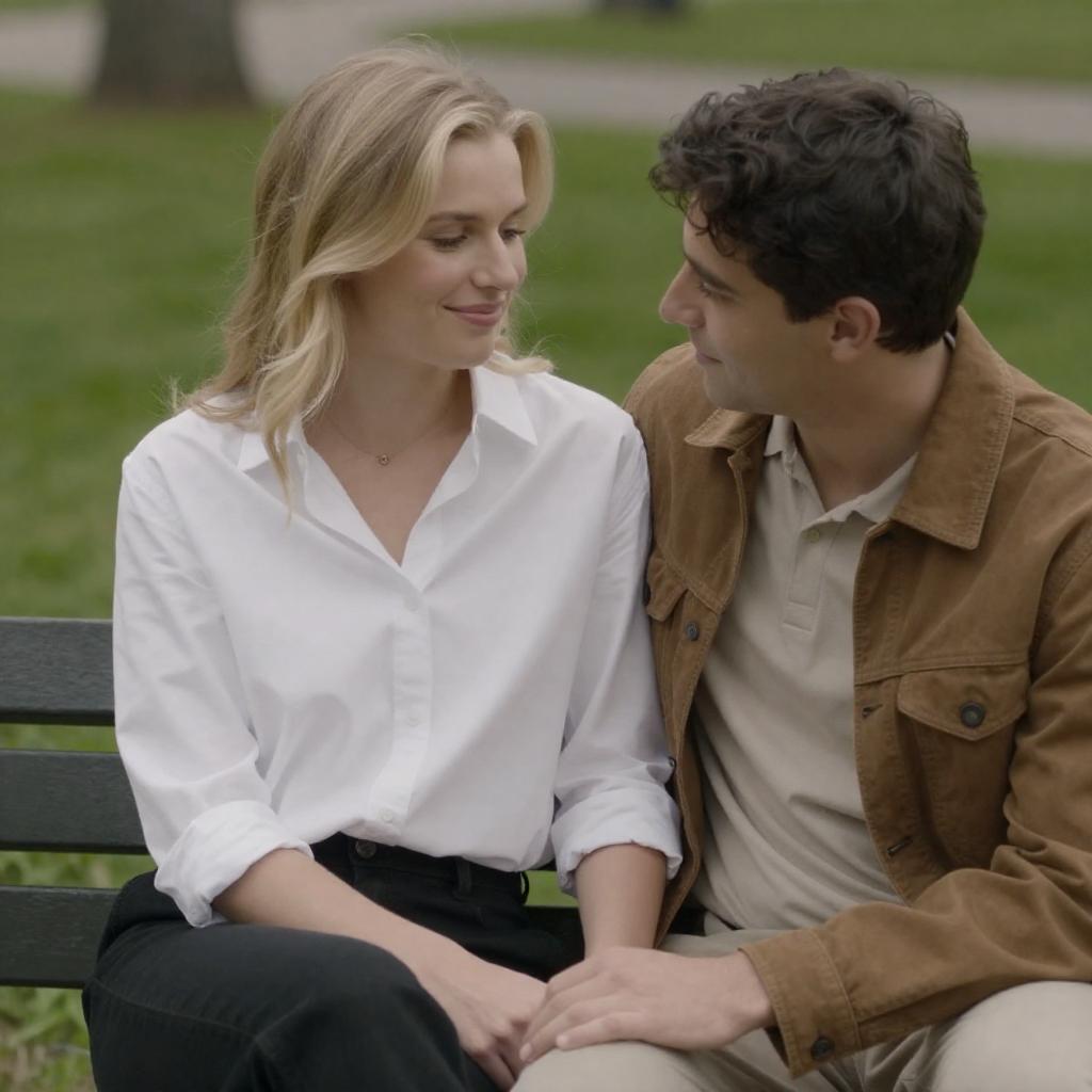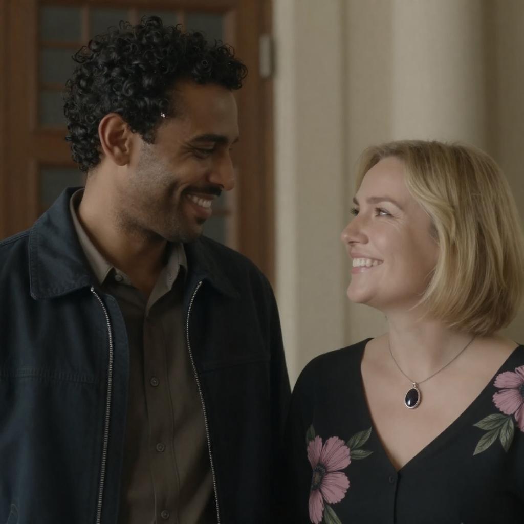 Photograph of a smiling man and woman standing close together indoors. The man has dark, curly hair, brown skin, and wears a dark jacket over a brown shirt. The woman has blonde hair in a short bob, fair skin, and wears a black top with pink floral accents and a silver necklace with a dark gemstone. The man is on the left, woman on the right. Both are looking at each other and smiling. Background includes a wooden door with grid-like pattern and a beige column.
