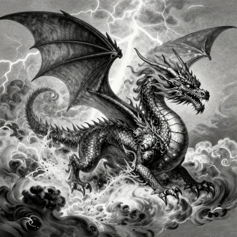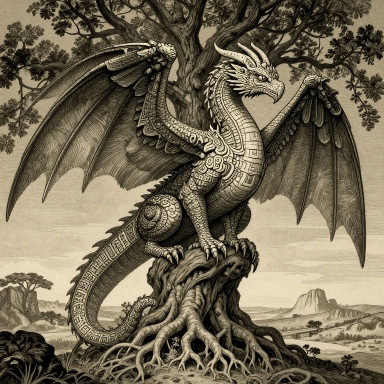 Envision an otherworldly creature with a dragon-like physique and bird-like wings, meticulously designed in the style of intricate Doré-inspired illustrations. The beast's scales are adorned with ancient Aztec patterns, creating a mesmerizing fusion of mythical beasts and cultural motifs. Perched atop a towering tree, its roots entwined with the rugged landscape, this scene invites viewers to soar above and marvel at the awe-inspiring amalgamation of nature and fantastical creatures, evoking a sense of wonder and reverence for the enigmatic existence that lies within this captivating realm.