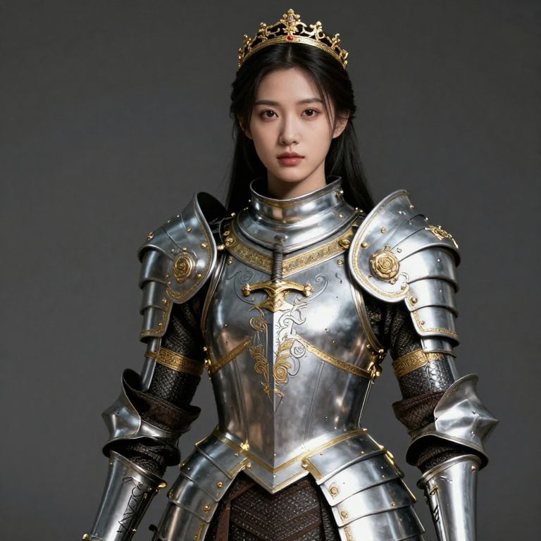 A white-haired knightess in medieval armor stands in a castle, holding a sword.