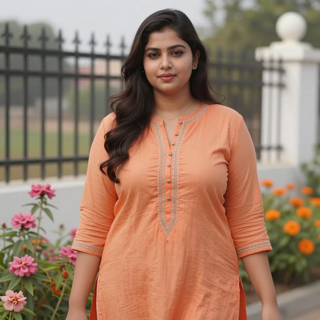 Asian kaftan dress, photograph of a beautiful Asian woman, long wavy brown hair, wearing a light turquoise traditional Indian dress with orange and red floral patterns, V-neck, tied at the waist, standing in a lush green garden, sunlight filtering through the leaves, warm and soft lighting, relaxed and confident expression, earrings visible, fabric ure and colors are vibrant, background slightly blurred, natural and serene atmosphere
