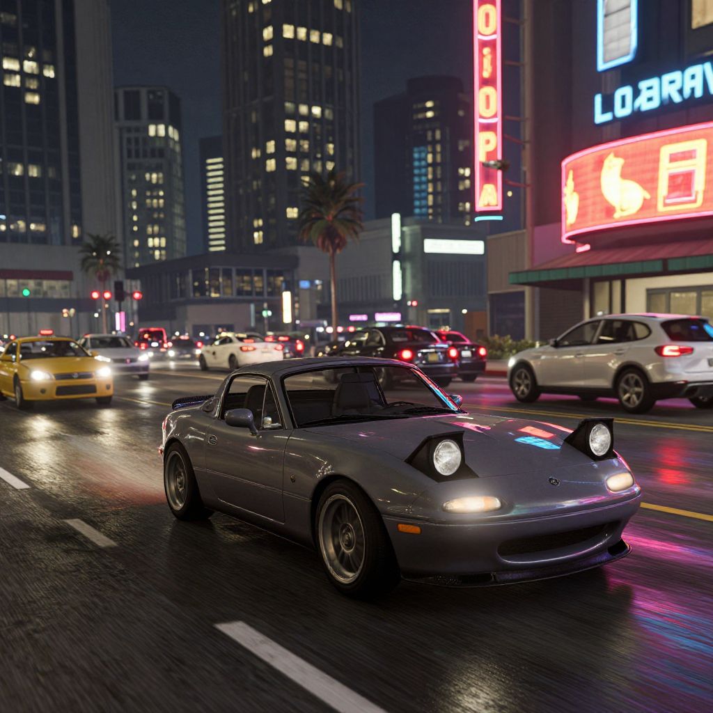 Miata in GTA 5 cruising through the busy neon-lit streets of Los Santos at night, vibrant reflections on wet asphalt, detailed car model with realistic lighting and motion blur, dynamic urban environment with towering skyscrapers and bustling traffic.