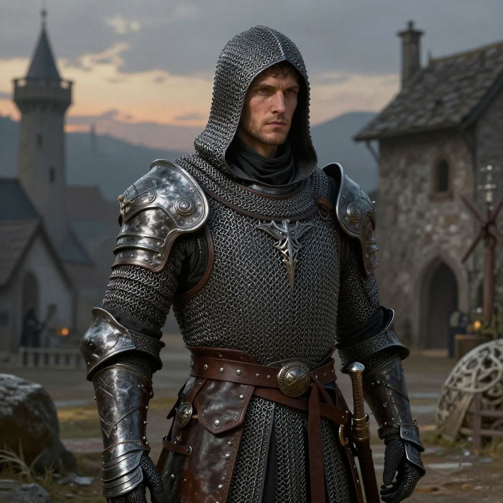 Male fantasy light armor featuring lightweight chainmail and leather, with ornamental shoulder guards and a hood, moody twilight setting in a medieval village, intricate craftsmanship visible, hyper realistic digital painting